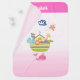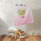 A personalized blanket designed with a cute nursery style illustration with an ark filled with wild animals and a butterfly flying overhead and a friendly whale spouting water below. Some blue clouds float on by. Set on a light pink ombre background.