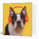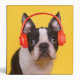 This cute Getty Images photo features a Boston Terrier with red headphones.