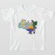 The cutest Dino T-shirt features a playful design of a baby dinosaur with big, sparkling eyes and a wide smile, holding a tiny leaf or flower. The dino is surrounded by vibrant colors, like pastel greens, blues, and yellows, with a heart or star pattern in the background. The shirt itself could be a soft fabric in a cheerful base color like light pink, mint green, or sky blue, perfect for adding a touch of whimsy to any outfit!