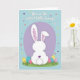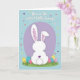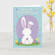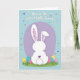 This card shows a stylized white bunny seen from behind, sitting quietly with long upright ears dotted in soft lavender, plus a fluffy tail with a hint of texture. A small deep-purple heart rests on its back, like a gentle sign of affection between close friends. Behind the bunny, a large lavender oval sits on a light blue background sprinkled with tiny hearts and dots in mixed pastel colors, adding a light, friendly romance to the scene 🐰. Along the top, the phrase “You’re the cutest little bunny!” is placed prominently in a flowing dark-purple style with a faint shadow so it stands out against the blue. Near the bottom, short green tufts of grass frame a cluster of decorated eggs, as if the bunny is guarding a sweet surprise for someone special 🌷. The eggs are patterned with stripes and simple shapes in yellow, turquoise, and pink, scattered across the foreground. The overall palette stays soft with lavenders, pale blues, and gentle pastels, and the bunny’s lavender-dotted ears and purple heart echo the colors in the background. Just below the bunny, the grass and eggs sit against the light blue field with small floating hearts and dots around them.