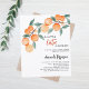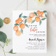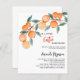 A white. Decorated with watercolored oranges. Personalize and add a name and party details. Text: A little Cutie is on the way.