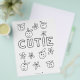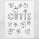 Delight the little guests at your baby shower with our Cutie Coloring Page. This engaging page features the word "Cutie" in bold block letters, perfect for coloring in. Surrounding the text are adorable little cutie oranges with sweet faces, along with charming flowers to color. This activity is sure to keep kids entertained and add a touch of fun to your event. (For best results, choose thin matte paper when ordering.)