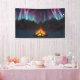 In a snow-covered valley on a frosty night in the dead of winter a bonfire leaps up to mirror the northern lights filling the sky above the distant mountains.