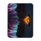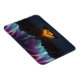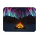 In a snow-covered valley on a frosty night in the dead of winter a bonfire leaps up to mirror the northern lights filling the sky above the distant mountains.