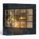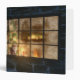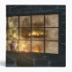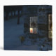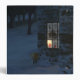Looking in the cottage windows on a frosty winter night just before Christmas. Bright red candles are alight, sending a warm glow out over the snow. The Christmas tree and mantle are decorated with crimson and gold balls. A calico cats looks out the window at a chickadee sitting outside on the sill, and a pair of foxes peep around the corner of the little house.