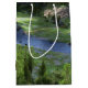 A winding path leads over the mountains to a solitary river valley. It crosses the rocky stream over a line of stepping stones and ends at a lonely house nestled under the trees at the foot of the hills. The mountain meadow is filled with the green grass and patches of blue and pink flowers. The overshadowing peaks are still covered with snow on this spring morning.