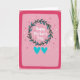 This greeting card features a blush pink background with a leafy wreath circling a short message set in white lettering near the top center. The wreath mixes lush green and aqua-toned leaves, giving the design a fresh contrast that feels like a gentle embrace ❤️. Beneath the wreath, two matching cyan hearts sit side by side, like a quiet pair sharing the same beat. Small confetti-style marks—tiny red asterisks, scattered white dots, and little cross shapes—float around the page, adding a light, friendly energy 🌼. The main text sits neatly inside the wreath, while the hearts anchor the lower portion of the layout. A deeper fuchsia border runs around the edges in slightly uneven, drawn lines, making the frame feel intimate and close. The overall palette shifts from soft rose to richer pinks, with the cool blues and greens standing out against the warm field. Along the margin, the fuchsia outline stays irregular, with corners that look gently sketched rather than perfectly straight.