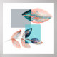 Modern design with squares and leaves in contrasting cyan, red, and orange colors.