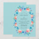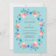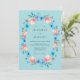 A vibrant watercolor floral design creates a cheerful atmosphere for a spring event. The artwork features peach roses paired with bright blue anemones and lush foliage against a soft light blue background. Artistic strokes add a dreamy and ethereal quality to the botanical elements. This warm peach and cool blue palette offers a refreshing aesthetic for a seasonal nuptial ceremony.