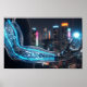 A stunning, photorealistic image of a highly detailed cybernetic arm with a sleek, metallic finish. The design features glowing blue energy conduits, intricate mechanical gears, and a hand holding a glowing data chip, all set against a blurred neon-lit cyberpunk city. This piece is perfect for fans of sci-fi, technology, and futuristic art.