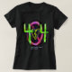 Cyberpunk look t-shirt with glitchy cyber graffiti graphic 404 Error in hot pink and lime green to evoke the neon city lights of a seedy post-apocalyptic cyberpunk underworld. Broken heart as the zero in the center of a no symbol. Glitchy, static-y graphic art looks like futuristic street art painted with pixels.