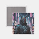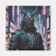 This intense image portrays a menacing demon samurai, adorned with a futuristic, dark outfit and a mask with glowing red eyes and horns. Set in a neon-lit, urban environment inspired by cyberpunk aesthetics, the character stands amidst numerous illuminated signs and symbols, suggesting a bustling, high-tech cityscape.
