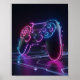 Upgrade your gaming room with this sleek cyberpunk gaming controller poster in a high-contrast, minimalist style. This close-up illustration features a gaming controller outlined with neon pink, blue, and purple lights, resting on a reflective black surface with faint glowing circuit lines beneath it. The dark gradient background and minimal pixel glitch effects add a futuristic, aesthetic feel, making this artwork perfect for gamers looking to add a bold, cyberpunk edge to their decor.