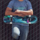 "Dive into the depths of the digital world with the 'Cyberspace Conqueror: Hacker's Realm Skateboard Deck'. This design portrays a futuristic hacker, eyes aglow with digital prowess, navigating the complex realm of cyberspace. Surrounded by streams of code and cybernetic interfaces, the hacker stands in a virtual reality landscape, a digital grid alive with floating geometric shapes and holographic data panels. The electric blue and neon green color scheme against dark shades encapsulates the enigmatic and immersive world of hacking. Beware the evil twin