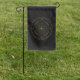 Cycles garden flag. Cycles is a Germanic design created by Anna M. Asbury and consists of a black background with an Aegishjalmr in the center and encircled by Elder Futhark Runes. The design is enclosed in a diamond with the Ingwaz Rune, flanked on all four sides with a bind rune, and encircled by the Jera and Ingwaz Runes.