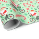 Creative biking holiday gift wrap featuring cartoon cyclist Santa cycling on a bicycle surrounded by Christmas treats.