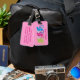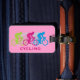 Cycling Design Luggage Tags with pink background for easy identification and customizable personalization. To change background color, select customize, edit and background.