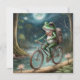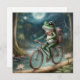 frog riding his bicycle by night during full moon surrounded by fire flies