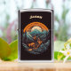 Cycling Life, retro painting in orange and blue of a cyclist riding through the mountains and forest with the sun in the background