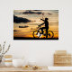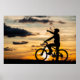 Silhouette of a 25-year-old man riding a bicycle, pointing to the right, with a helmet, against a sunset sky with clouds. The sky is a gradient of orange, yellow, and blue. The ground is dark and flat. The bicycle is a mountain bike with knobby tires. The man is wearing long sleeves and pants. The image is taken from a low angle.