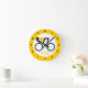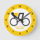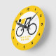 Cyclist riding his bicycle wall clock that displays a minimalist icon of a black cycling silhouette wearing yellow top and your text on white background with yellow border.