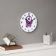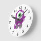 Adorable cyclops monster with one big eye partially covered by one stray curl and with one big buck tooth in Halloween purple and green smailes and waves hello. A cute, festive gift.
