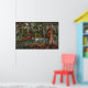 This beautiful vintage Florida poster shows a boating trip through waters surrounded by towering Cypress Trees and vivid flowers.