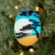 Ornament in a Japanese inspired silhouette of a cypress tree, framing a full moon, against an aqua and coral orange sky