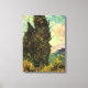 Cypresses by Vincent van Gogh is a vintage fine art post impressionism landscape nature painting. Cypress trees in a meadow, white fluffy clouds in the blue summer sky and a sliver of a crescent moon.