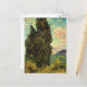 Cypresses by Vincent van Gogh is a vintage fine art post impressionism landscape nature painting. Cypress trees in a meadow, white fluffy clouds in the blue summer sky and a sliver of a crescent moon.