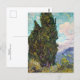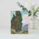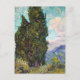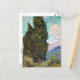 A fine art postcard with the painting, Cypresses (1890) by the Dutch artist Vincent van Gogh (1853-1890). A post-impressionist landscape with a large cypress tree in the foreground and a swirled colorful sky with a crescent moon.