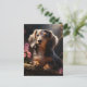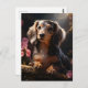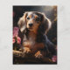 In this captivating portrait, a dachshund dog rests gracefully on an aged wooden log, surrounded by blooms in shades of gentle pink. The warm glow of sunlight filters through the foliage above, illuminating the dog's glossy coat and the delicate petals of the flowers surrounding it. generativecontent