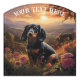 This door sign features an adorable black & tan Daschund dog sitting in the countryside at dusk with the set setting. A charming door sign for any Dachshund lover. generativecontent