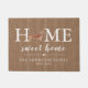 Personalized home sweet home door mat featuring a Dachshund dog, with your family name & year established, set on a brown burlap look background