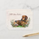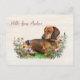 Dachshund dog lover postcard with custom text on the front. Send a note that begins with, "Hello from .. name" in brown script. Continue your message on the back with your own handwriting. Light brown wood boards background, with a sweet brown dachshund pup lying among the wildflowers.