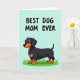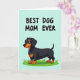 This card features a long-bodied, short-legged dog shown in profile, giving a gentle, attentive look that feels like loyal friendship ❤️. The dog has a dark charcoal coat with burnt orange patches on the snout, chest, and paws, creating a striking contrast without looking harsh. Its ears stand up slightly, and the small smile in its muzzle adds a tender, companionable mood. Behind the dog is a soft mint-green background that keeps the scene calm and airy. Along the bottom, a band of stylized emerald grass grounds the figure, with a small shadow beneath the belly to add a bit of depth. Near the top, two lines of rounded black text sit centered across the upper area, standing out clearly against the pale background 🌼. The letters are thick and smooth, with the message arranged to fill most of the upper half above the dog’s head.