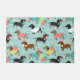 Cute birthday party dachshund dogs with black, tan and dapple coats dressed in cute birthday outfits with balloons, cake and confetti pattern.