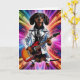 A Dachshund in a shiny silver outfit is playing guitar with a psychedelic background.