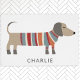 A fun little Dachshund Sausage or Wiener Dogs in striped woolly knitwear. Perfect for your favorite furry friend. Original art by Nic Squirrell. Change the name or text to personalize.