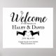 Welcome guests to your wedding with these whimsical dachshunds and hearts black and white sign with wedding date and a place to invite guests to share their photos with a specific hashtag.