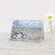 A blue motor cycle standing on a beach with fluffy clouds in the sky. Happy Birthday written in rock reflected in the water lying on the sand.