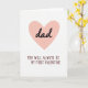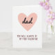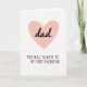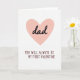This greeting card shows a large blush-pink heart near the top on a white background, with soft, rounded edges that feel gentle and welcoming. Inside the heart, the word “dad” appears in smooth black cursive lettering, centered and easy to notice. Below the heart, the message “YOU WILL ALWAYS BE MY FIRST VALENTINE.” is printed on two lines in maroon, using a classic serif style in all caps. The layout is simple and focused, so your eyes move from “dad” down to the longer message without distraction. The pink, black, and maroon colors work well together and keep the mood calm and loving. It feels meaningful because it thanks a father for being a first example of love and care, in a way that’s direct and honest ❤️. Giving it can be a sweet way to show affection and appreciation, whether from a child or an adult remembering those early bonds 🥰.