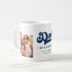 Coffee mug featuring the text "Dad, we love you" in dark blue, little light blue hearts and the kid's names along with two custom photos on the sides.