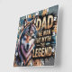 This powerful graphic features a striking, colorful wolf portrait with piercing yellow eyes against a rugged, textured wooden background. Prominently displayed alongside the wolf is the bold text "DAD," followed by "THE MAN, THE MYTH, THE LEGEND". This design is a strong and appreciative tribute, celebrating a father's enduring strength and legendary status.