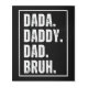 Dada Daddy Dad Bruh is a funny retro distressed white on black typography design of the four stages of names a man is called while raising children. A perfect father’s day or birthday or any time gift just right for hanging in a place of pride for a special dada, daddy, dad, papa, pop, father, husband from a wife or child or kids.