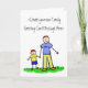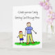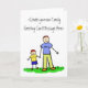 Father and son hold hands. The father's shirt read "daddy" and the little boy's shirt reads "me". The family has red hair. The image comes in multiple color versions. There is also a no color drawing version too Customize this note card with your personalized greeting message to make a special custom greeting cards for Father's Day, new fathers, family reunions, or other special family holidays.