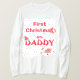 Daddy's First Christmas design features the phrase, "First Christmas as DADDY" in bright red letters. A Santa hat is displayed balancing on the edge of the letter "D" for Daddy. A Christmas wreath hangs playfully on the end of the word Christmas and Santa's sleigh is pictured below, filled with presents. Tiny green and red speckles are displayed throughout.