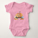 Orange, ivory, sage green, and baby blue pumpkins on doilies with autumn leaves on a pink baby girl's bodysuit in the color and size of your choice.