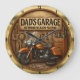 This circular wall clock features a rustic wooden panel background with "DAD'S GARAGE" in bold letters and "NO WOMEN WE KNOW ALLOWED" beneath it. The scene displays a classic orange and black motorcycle, along with various tools hanging on the wall, a toolbox, and loose wrenches and a tire on the floor. The clock has a golden, ribbed frame.