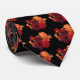 A dramatic repeating pattern of dahlias in autumn colors of red, orange and gold on a black background adorn this very striking tie, creating a geometric, abstract design.
